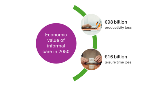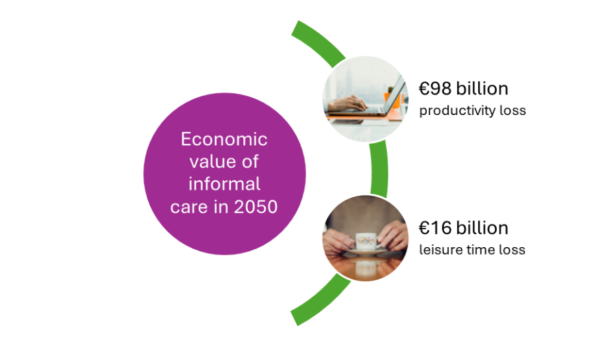 Alongside these volume projections, we conducted a monetary valuation of informal care. This valuation presents methodological challenges: should caregiving time be treated as a loss of productivity, or as a loss of leisure time? Depending on the chosen approach—ranging from the opportunity cost of leisure to valuation based on productivity losses—the estimated economic value of informal care in 2050 ranges from €16 billion to €98 billion per year.